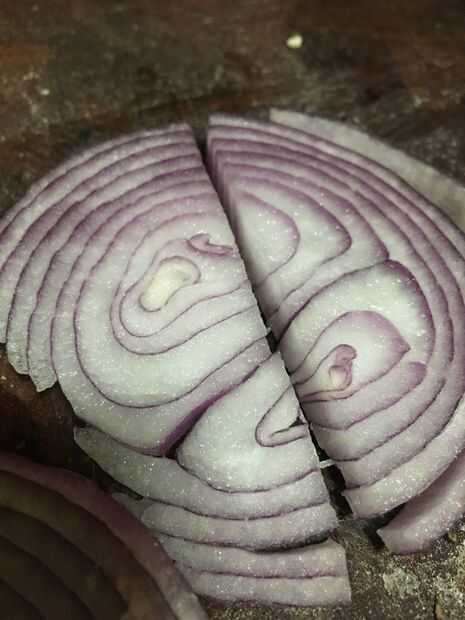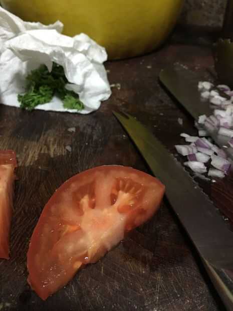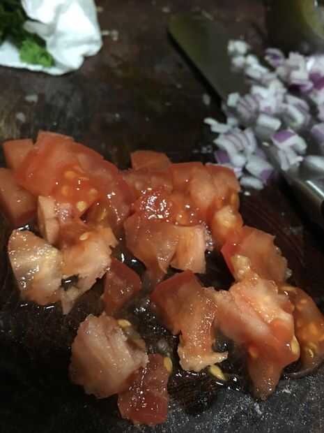Rebane la cebolla y los tomates, luego cuarto las rodajas y luego picar mientras gira los cuartos. Da usted muy bien, finamente picada cebolla y los tomates. Utiliza un cuchillo tomate los tomates para que no triture.