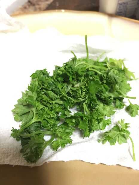 Retire los tallos del perejil (no tengo ninguna casa de la moneda, pero que trabajo así). Enjuagar, escurrir y secarlas con una toalla de papel.