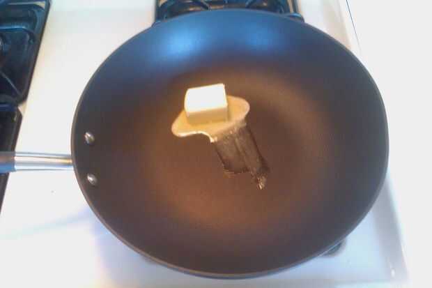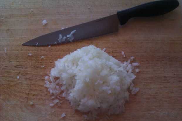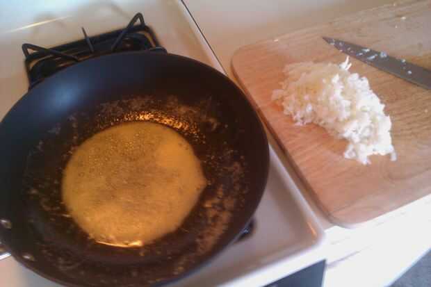 Derretir 3 cucharadas de mantequilla (o ghee) en una cacerola grande a fuego alto. Después de que la mantequilla se haya derretido, añadir la cebolla picada y freír a un color marrón claro.