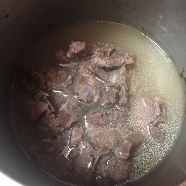 tomar una olla a presión. poner la carne en ella y añadir sal y agua (Asegúrese de que la carne es solamente un poco surgió en el agua)