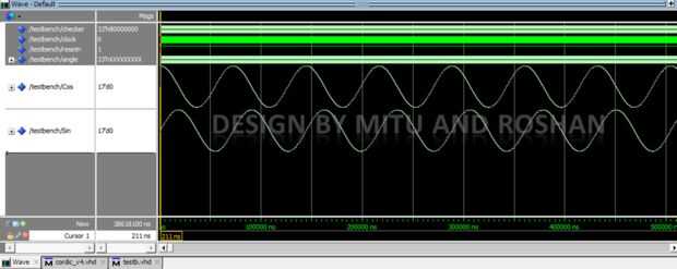 (2) la salida del diseño es su valor de seno y cos en 16 bits + signo bit .ie; con precisión 0.00001526. Tenga en cuenta que la salida se muestra en 2 complementan forma si el valor respectivo del seno o el cos es negativo.