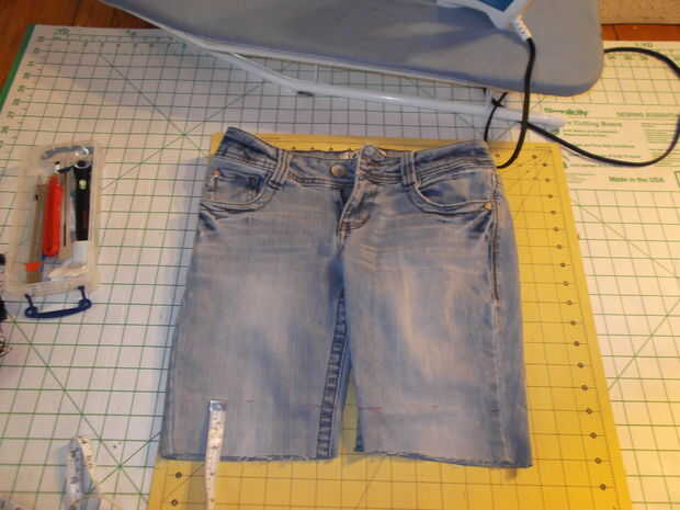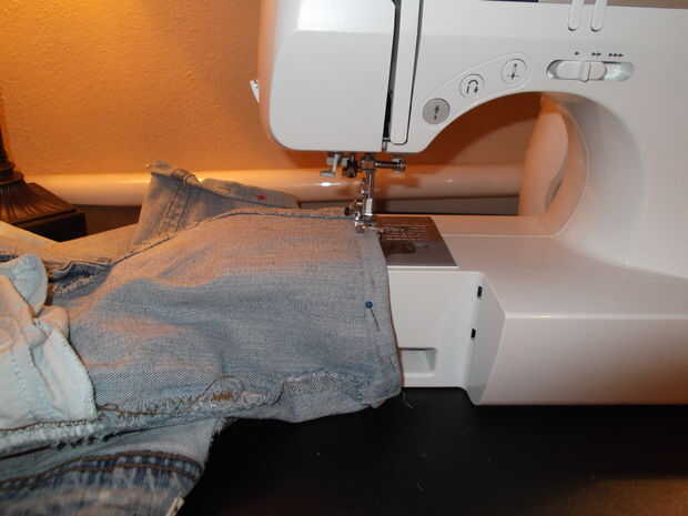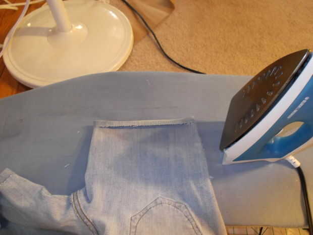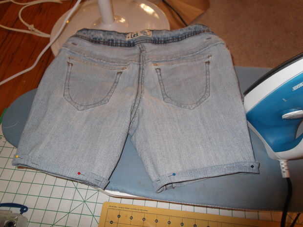 Si decides dobladillo de los pantalones cortos de jean, en lugar de dejarlos raído, entonces primero debe poner los cortos adentro hacia fuera. Luego, doblar en 3/4 de pulgada en la parte inferior, hierro y repetir una vez más (por lo que se dobla dos veces). Luego el dobladillo del perno en su lugar y coser, quitando alfileres mientras avanzas a lo largo.