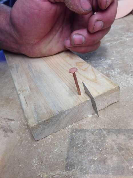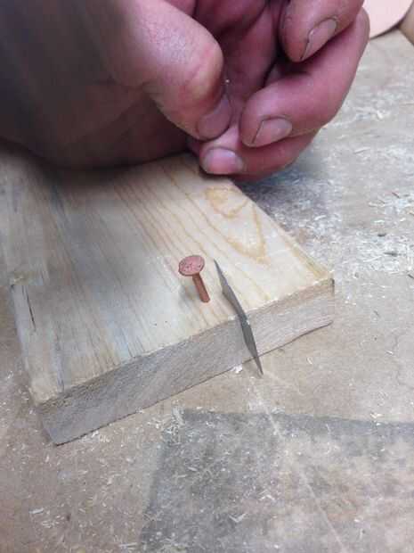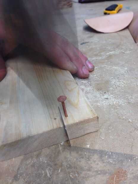 Ponga el clavo, la distancia que quieras la anchura de su cordón de cuero que, de la hoja y del lado derecho de la hoja hacia la hoja, si dejó entregados (foto 4) y a la izquierda de la hoja si es correcta entregado (Foto 5) y martillo el clavo en el tablero así su firmemente en lugar.
