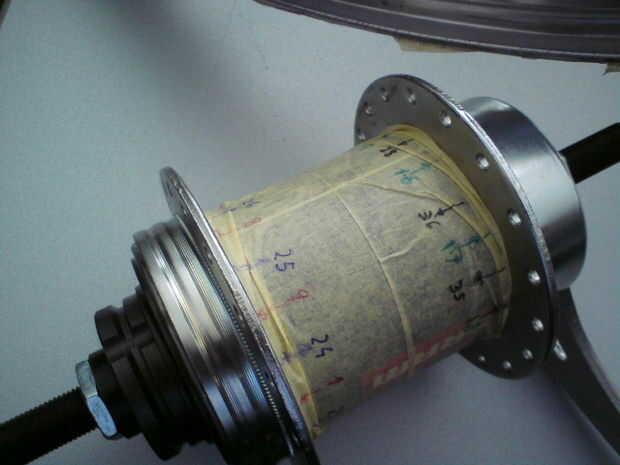 Si usted está construyendo un disco nuevo, copiar los números en la nueva llanta. Preste atención para comenzar la numeración al lado de la abertura de la válvula. Los agujeros del rayo en el borde se cambian de puesto al lado de la brida del eje. Algunas llantas pueden comenzar con el primer agujero desplazado a derecha o a la izquierda. Si la nueva llanta no es el comienzo hacia el mismo lado comienzan con el número uno un agujero más. La idea es dejar la válvula en un lugar con suficiente espacio para utilizar una bomba.