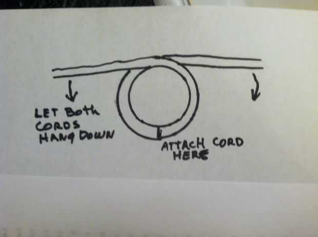 Surgió una nueva idea de girar la perilla con un cordón alrededor de la perilla y colgando hacia abajo en ambos lados. Probé un trozo de paracord, pero era demasiado duro sin algo pesado en ambos extremos. Se me quitan las cuerdas internas de la paracord. Forma todavía demasiado rígida y voluminosa. Decidí usar los cables de interiores que había extraído de la paracord. Es un hilo de nylon que es muy flexible y de tamaño pequeño. Os adjunto a la perilla en el patrón mostrado y ponderados los extremos con algunas muy pequeñas tuercas hexagonales #6. Utilicé una pistola de pegamento caliente del derretimiento para sujetar el cable para el mando y las tuercas. La perilla es posterior biselado, mayor diámetro que las delanteras. Que mantiene el cable del desplazamiento de la parte posterior. Las clavijas verdes mantienen el cable de deslizamiento al frente.