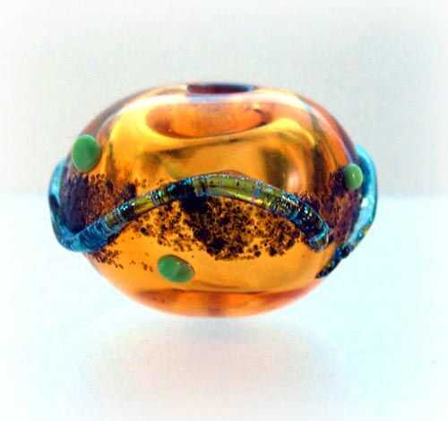 este grano fue realizada utilizando un mandril hueco, vidrio dicroico y polvo Tink. Es muy bonita en persona, una forma agradable y lo vacío, la luz se refleja en su interior.