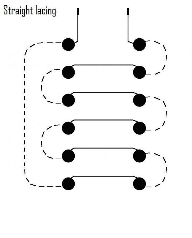 El último ojal obtiene un corto lazo con un nudo en el extremo, tomando el lugar del "perno de ojo de ancla" en el