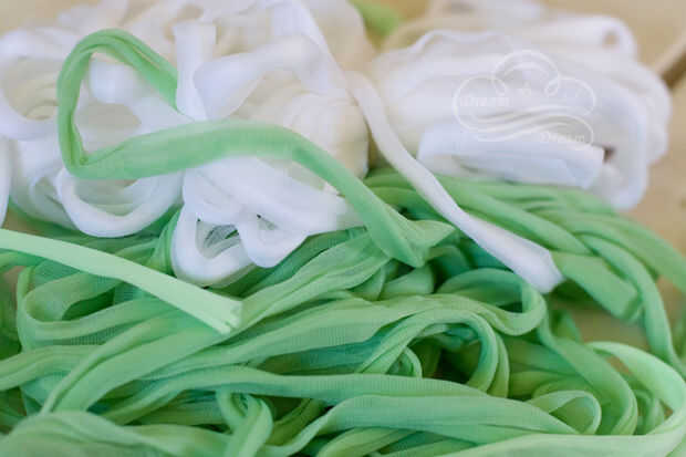 elástica tela de nylon-como no-fray cortar 2 tiras de 2 pulgadas de ancho de longitud 4,5 yardas, o una tira 9 yardas de largo. Coser varias tiras juntas para llegar a la longitud si es necesario.
