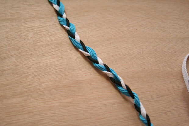 Ahora, con cinta las puntas de los cordones en la parte superior de una superficie dura y empezar a trenzar hacia abajo. Asegúrese de que la trenza es agradable y apretado, y para también dejar algunos parafina en la parte superior y así que usted puede atar la pulsera juntos.