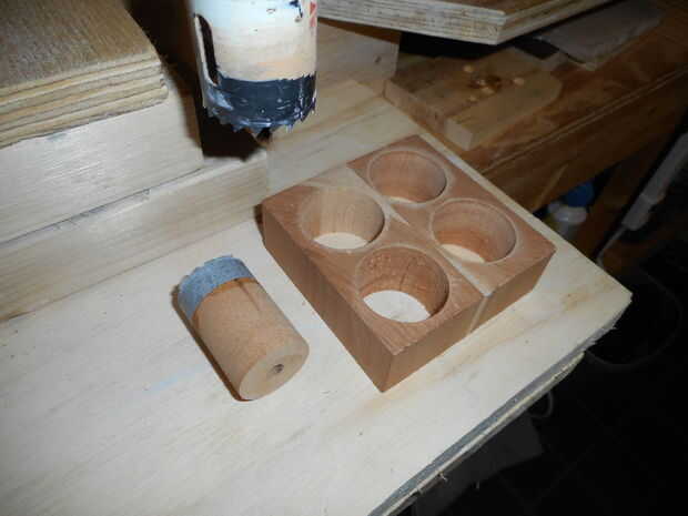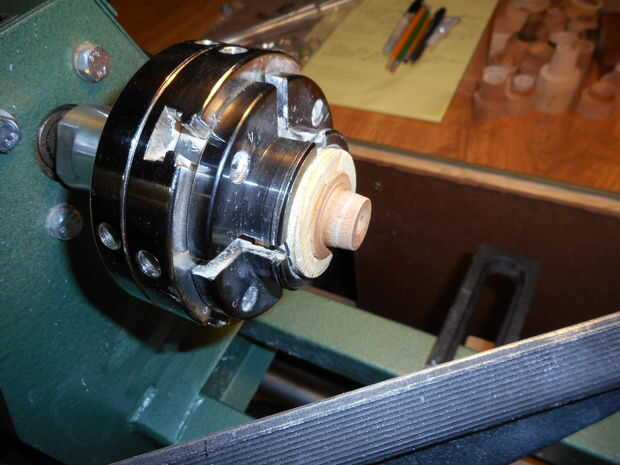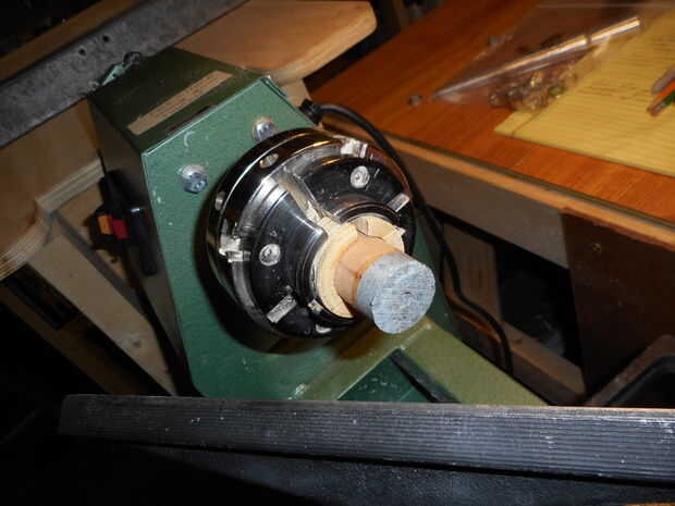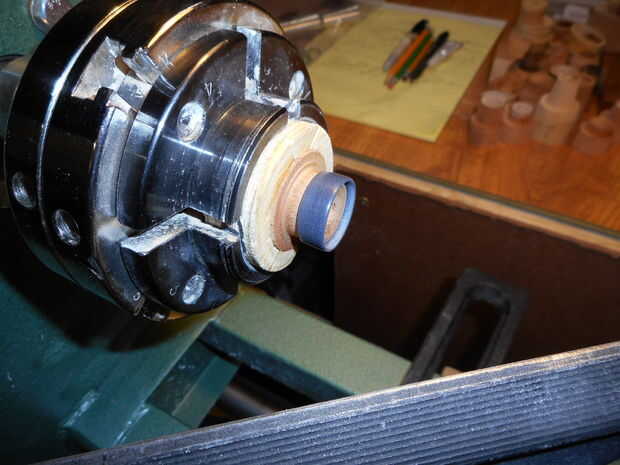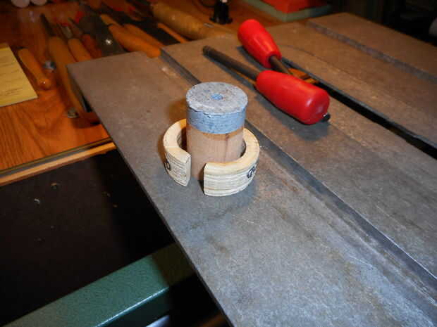 Para mantener el espacio en blanco en el rollo chuck que utilizar dos piezas de madera contrachapada que se cortaron con un agujero más grande Sierra. Una vez adentro tamaño del anillo se corta el anillo de parte del bloque de pegamento (con una herramienta de despedida hecho en casa $2), pero deja el bloque de pegamento en el rollo de chuck. La izquierda bloque de pegamento encima y restante se forma un poco para sostener el anillo para el ajuste y acabado.