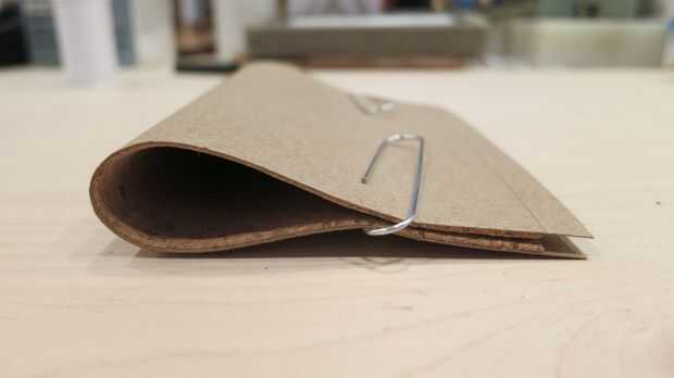 Hold up! Primero usted necesitará cortar la hoja de cartulina para que coincida con las dimensiones de la capa exterior del corcho. OK, ahora usted está listo para adherir el interior capa de corcho a la cartulina, centrado por lo que hay alrededor de 3/8" de papel a ambos lados del corcho. Una vez que se ha quedado atascado, forman el bolsillo y el clip se junto en la parte superior e inferior para prepararse para la puntada.