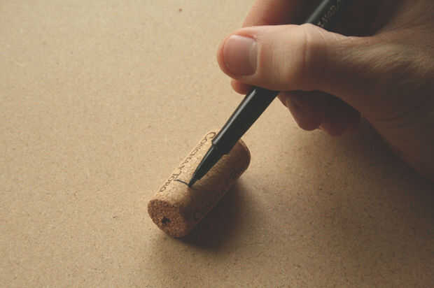 Utilizar un marcador de punta de fieltro para hacer una línea de aproximadamente 1/3 de la manera por la cara de corcho, con una longitud igual a aproximadamente 1/3 de la circunferencia del corcho; se trata de la "boca". En la parte inferior del corcho, hacer tres líneas equidistantes que conectan en el centro de los lados del corcho aproximadamente 1/8". En la parte superior solo hacen un punto en el centro.