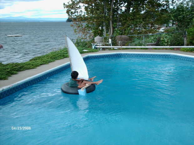 La madera estaba libre las sobras de pintura uy pintar $5, $5 tornillos de la caja de madera, lona $10 polos $.44 y encontré algunos ducha anillos de cortina un tennant dejó en el sótano e hizo dos barcos los tubos inter fueron $7 y $8 de un chico local que vende al lado de la carretera. Total para dos barcos aproximadamente $38.