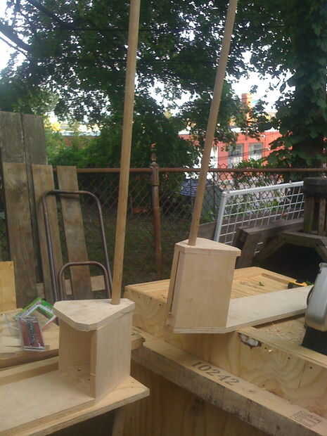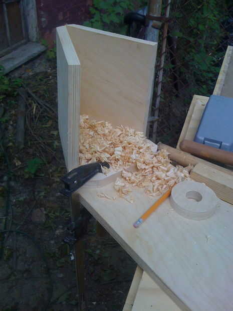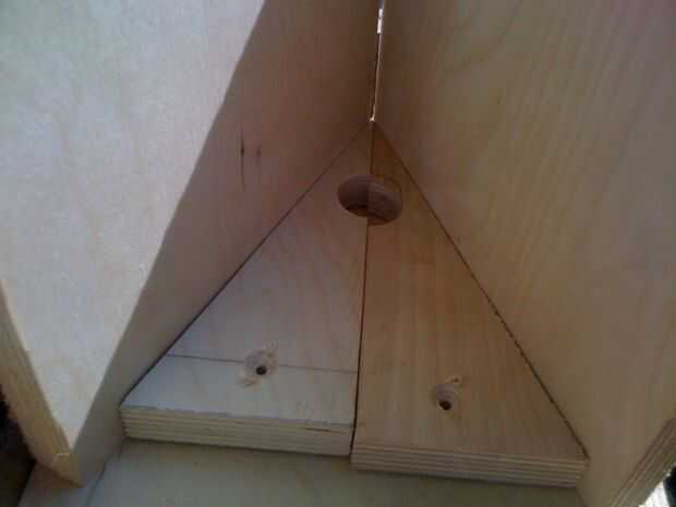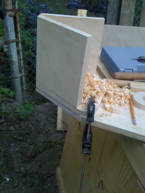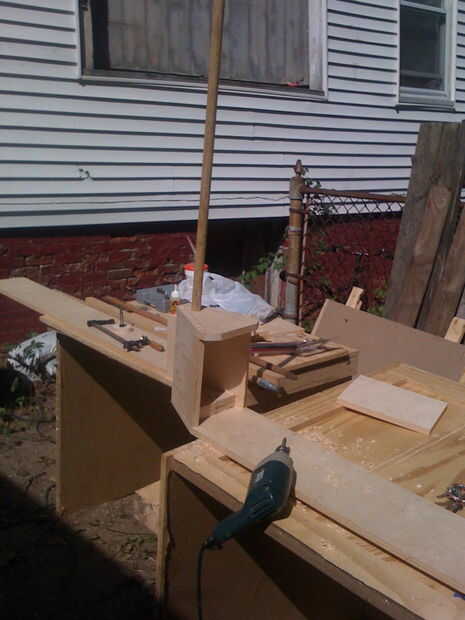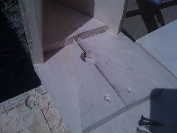 he utilizado el corte dos piezas dentro de la proa para sujetar el mástil.  Espacio para la perforación de los agujeros para el mástil era simple.  Después de la parte superior se atornilla en los lados empujé el taladro en la esquina en el arco iría y perforar hacia abajo.  Mismo con las piezas de corte había empujado y les perforado tan cerca como pude conseguir el taladro.