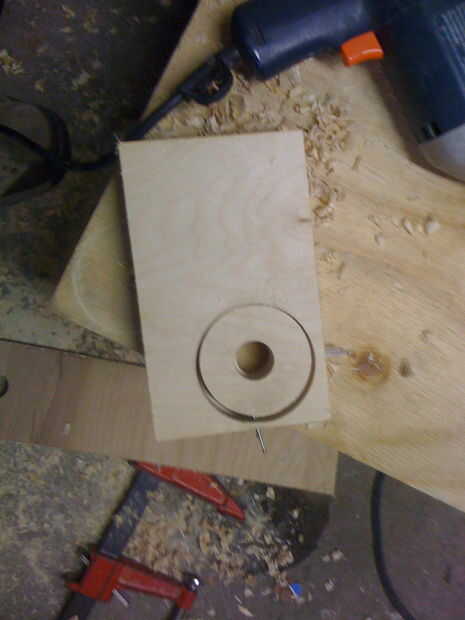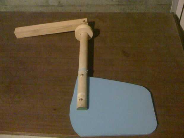 El timón se hace fuera de un polo cerrado que fue aplanado en un lado cerca de 5 pulgadas para arriba con un tablero de madera contrachapada de 3/8 con tornillos de latón.  Yo corte una lavadora gigante con una sierra.  El orificio grande se cortó primero (3 pulgadas) y luego el disco en con un clavo y el más pequeño agujero perforaron.   La parte superior del poste fue aplanada por ambos lados y se ranura en la manija para el polo entra en el mango y celebró con un tornillo.  La parte inferior de la empuñadura fue redondeada en la parte posterior para que el mango podría ser levantado.