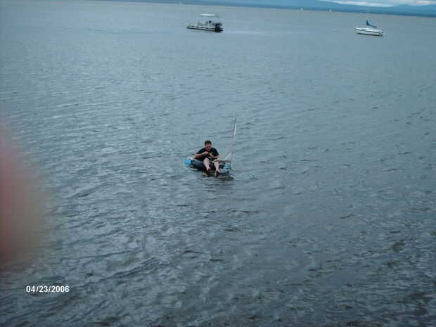La vela podría haber sido más grande.  Aquí el lago está en una bahía y es sólo 1-2 pies de profundidad hasta llegar más allá de los barcos en la imagen para mantenerse arrastrando el timón.  Tener un timón más pequeños sobre una bisagra habría evitado esto.  También pensé que una quilla pequeña 1-3 pulgadas habría ayudado a mantener el barco navegando más recto.   No se el peso hasta el próximo verano para intentarlo de nuevo.