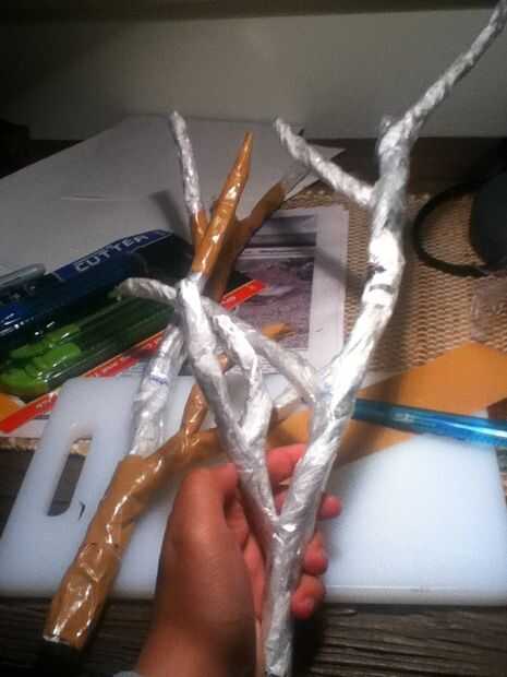 Si te fijas en los cuernos otra vez te darás cuenta que tiene 6 "ramas" que se pega hacia fuera, usted puede utilizar esa cantidad o menos. Diseñar cualquier forma que desee. Hacer lo mismo que hiciste en el paso 2, pero utilice la mitad los trozos de tamaño regulares de papel. Asegúrese de que usted hace dos de cada uno. Ahora cinta de ellos a la base en la posición que desee.