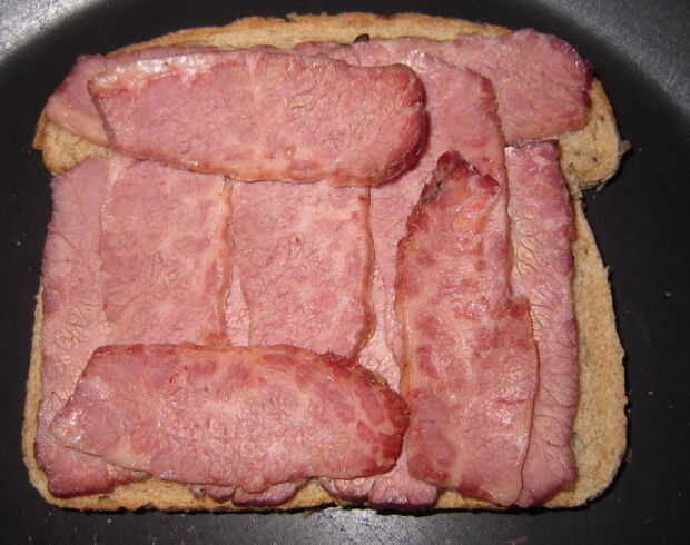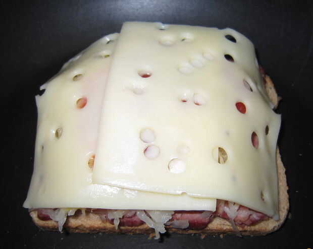 Cubra con el queso suizo y colocar otra rebanada de pan de centeno untado con mantequilla en la parte superior con el lado untado de mantequilla hacia arriba.
