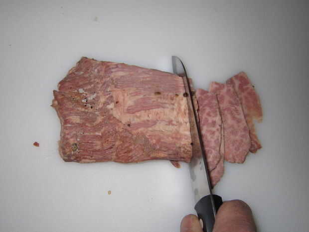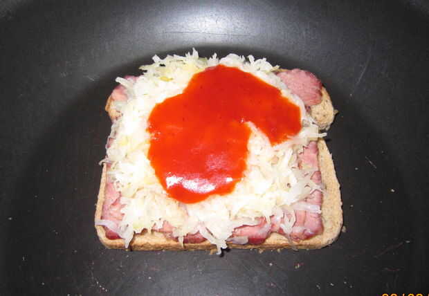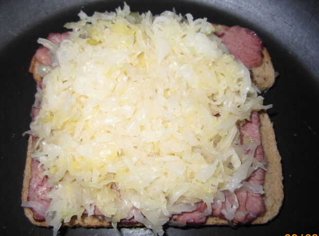 Una vez que tienes tu carne Pile una cuchara ranurada y algunos sauerkraut hacia fuera presionando la cuchara para exprimir algunas del jugo hacia fuera. Difundir algunos repollo encima de la carne.