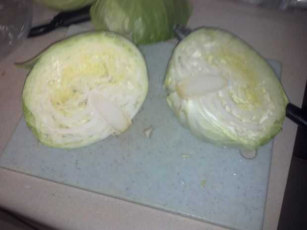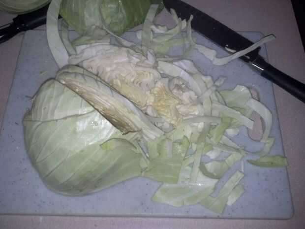 Cortar la cabeza de la col por la mitad. Cortar la col a la mitad y añadir luego corte o corte en trozos pequeños. Dejar de lado el repollo cortado en la heladera.