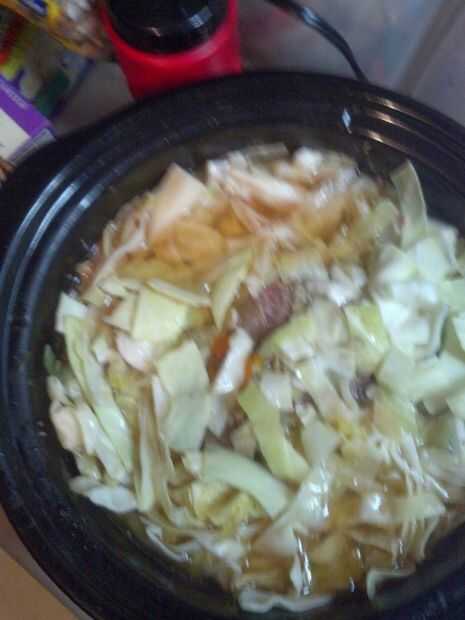 Establecer la olla baja si era alto. Agregue la col que se preparó antes en la olla y revuelva. Cocer durante una hora más baja.