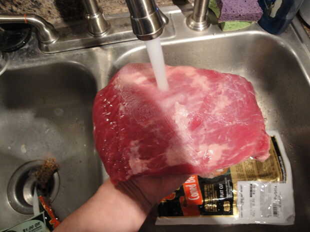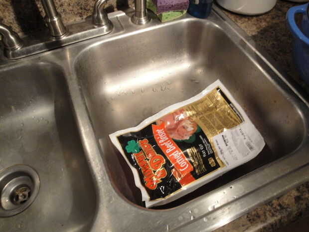 Lo primero es lo primero precalentar el horno a 300°. Definitivamente quiere abrir el paquete de Cecina en el fregadero desde su llena de jugos de la carne y la salmuera. Una vez que se retira del paquete debe enjuagarse bien con agua fría para lavar cualquier material suelto aún pegado a él desde dentro del paquete. La mayoría corned vienen de carne con un paquete de especias dentro de la cual nunca uso y teniendo en cuenta que estás leyendo esto que dudo que va a utilizarlo sea. Ahora coloque la carne en su olla y llenar con suficiente agua para cubrir la carne y colóquela destapado en la estufa a fuego med.