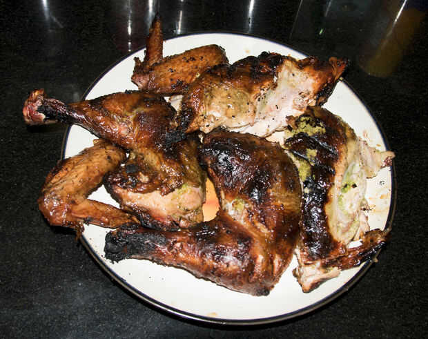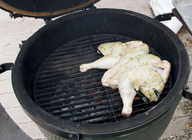 Cocinar durante 30 minutos y comprobar a la temperatura. Inserte un termómetro de sonda en la parte más profunda del pecho, usted está apuntando para 120 grados F (49 C). Cuando flip, el pájaro en el lado de la piel, colocado sobre la parte caliente de la parrilla, las piernas hacia el centro.