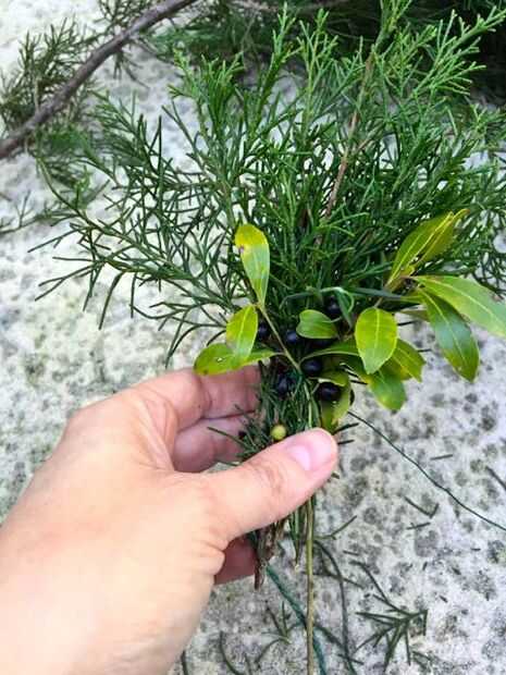 En este paso, se hacen paquetes de verdor y sujete a la guita envolviendo el alambre alrededor de los extremos de sus paquetes y la guita. Cada paquete superpone la siguiente mitad y continúa envolviendo el alambre y agregar paquetes hasta llegar al final de la cuerda.