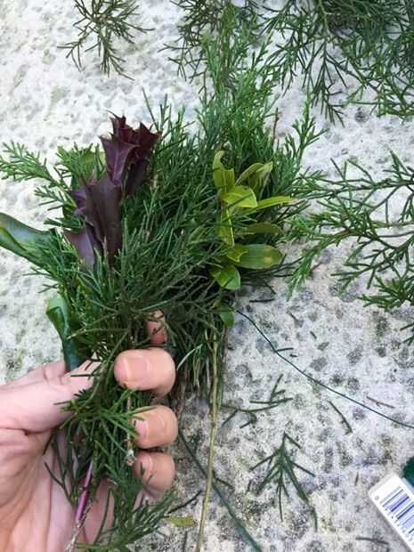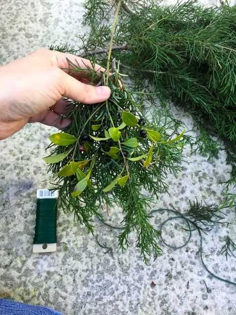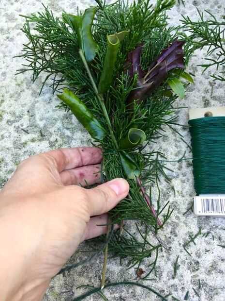 Figura 6: Hacer un conjunto de zonas verdes. Aquí es donde sus gustos personales en juego. Usar esquileos de jardín o podar a su verdor a la longitud deseada. Prefiero hacer pequeños paquetes como se muestra. Si usted está trabajando con holly, o no desea que sap en sus manos, esto sería un buen momento para poner en los guantes de jardín.