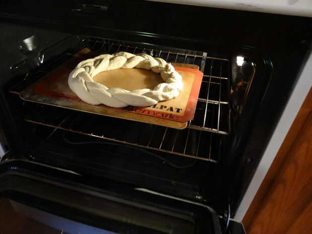 Que la subida de la corona de masa durante una hora en un lugar cálido, 70 grados o menos. Caliente mi horno por 2 minutos, luego lo apago y poner la masa en el proyecto.