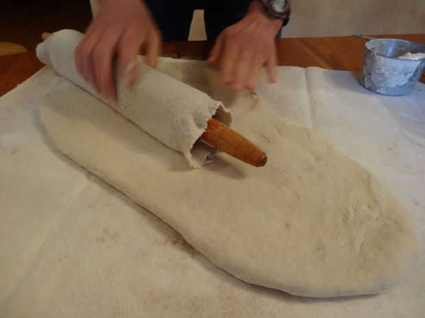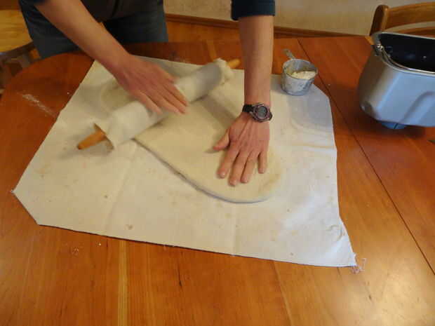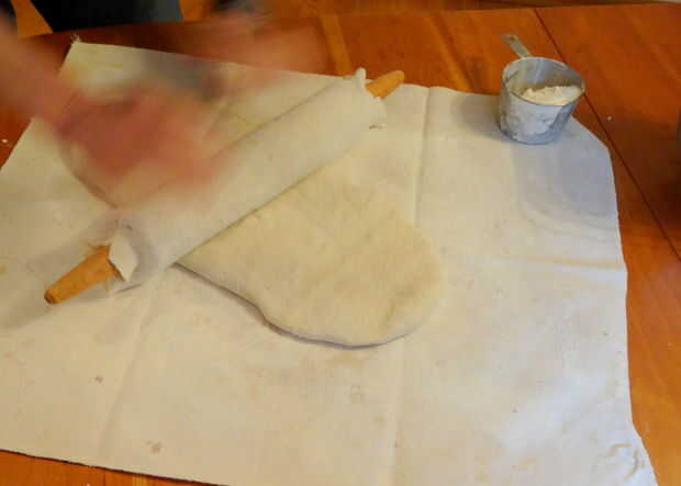 Recuperar la masa y estirar sobre un paño enharinado de superficie o masa con un rodillo.  Tamaño óptimo es de 9" de ancho por 30" largas del rectángulo.  Quizás tenga que dejar la masa descansar durante el proceso durante unos minutos estirar a este tamaño.