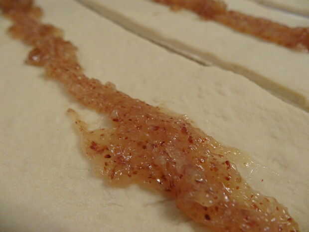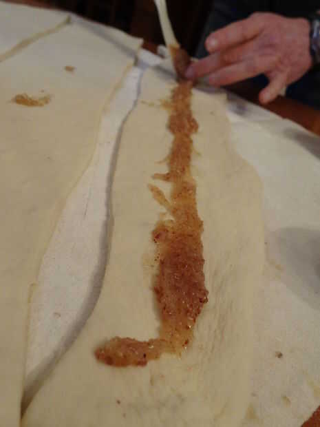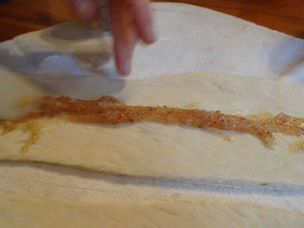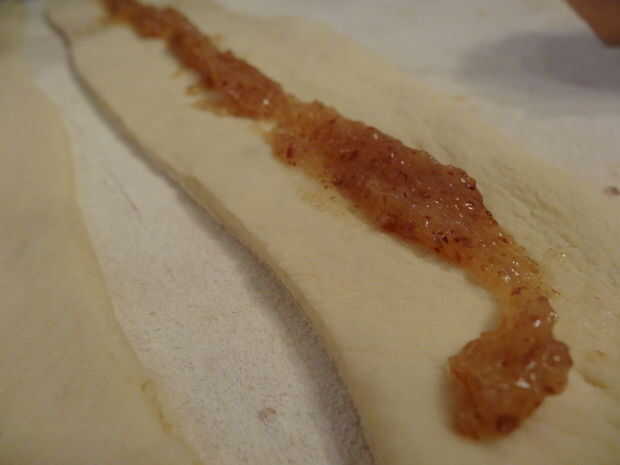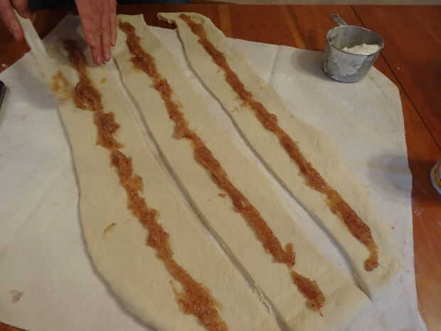 Extendió una línea de llenado de almendra en el centro y la longitud de cada tira.
