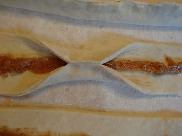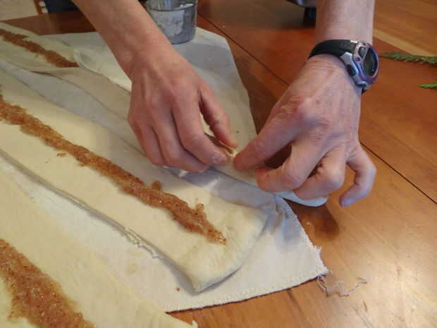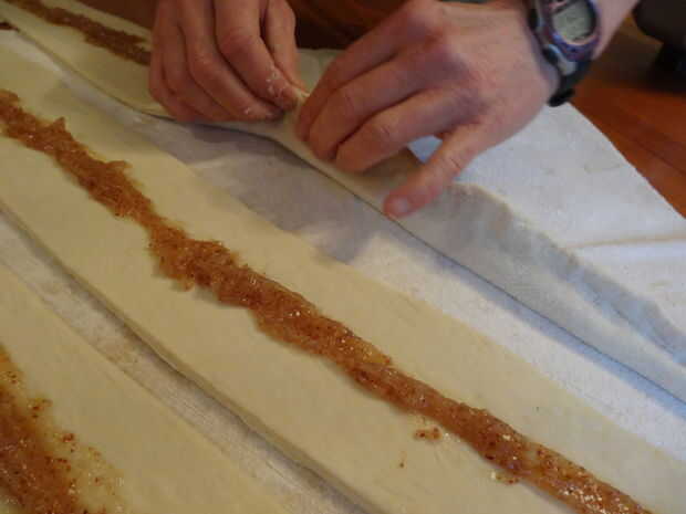 Pellizcar los bordes de la masa para sellar el relleno de almendras.