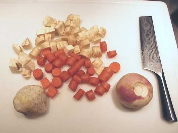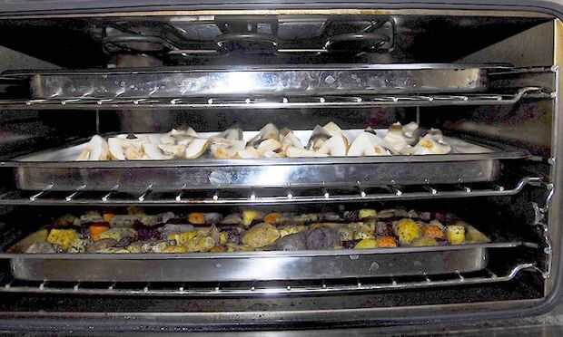 Friegue bien y picar en pedazos mordedura-clasificados. Revuelva en aceite, bien de temporada y la carga en bandejas de horno sin amontonamiento. Asado a 325F hasta que estén tiernos y sostenga si es necesario a 150F.