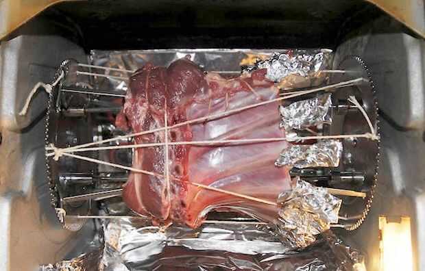 Estoy siendo lindo aquí por atar la carne para ser hilada en un asador Ronco. Esta cocina perfectamente y es muy divertido de ver. Sin embargo, usted también conseguirá resultados perfectos su corona en los extremos del hueso y dándole un asado lento a 325F. Deja pasar una hora y la prueba de temperatura interna en algunos puntos. La arquitectura abierta y la conducción ósea cocinarán más rápido de lo que puede esperar este asado. Continuar la cocción hasta una temperatura interna mínima de 145F. Entonces es seguro comer.