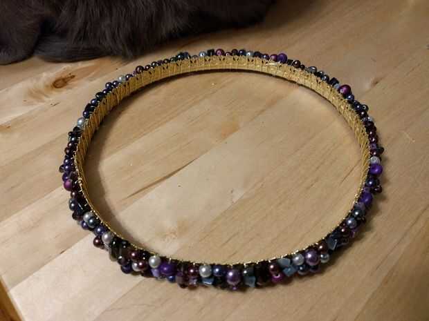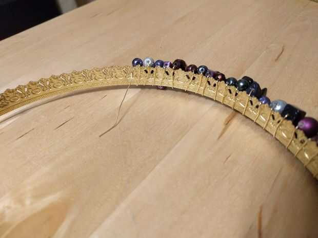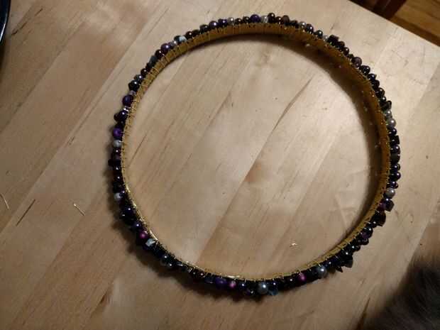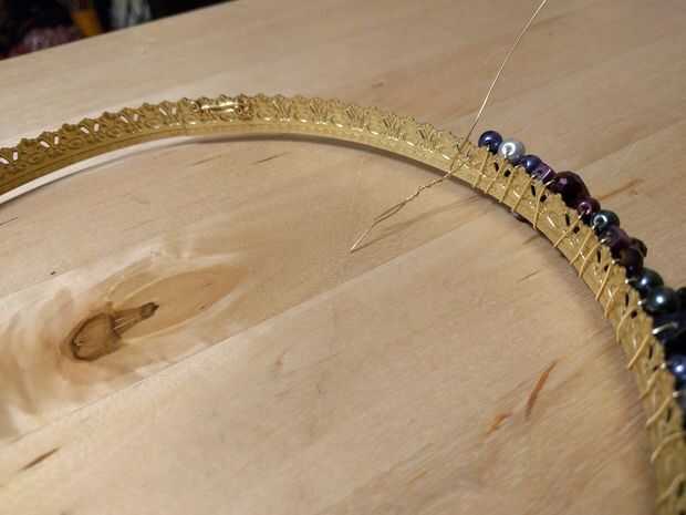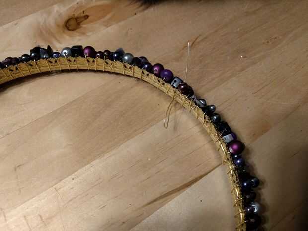 4. cuando el cable está en el exterior de la corona, colocar sus cuentas la forma en que desee buscar. Entonces cuando el cable está en el interior de la corona, mover las cuentas pasadas por lo que hay en el interior de la corona. Continúe envolviendo hasta que se quede sin granos y luego añade más cuentas para continuar envolviendo hasta que sobre 3-4" izquierda.