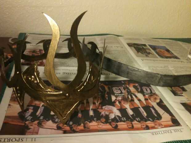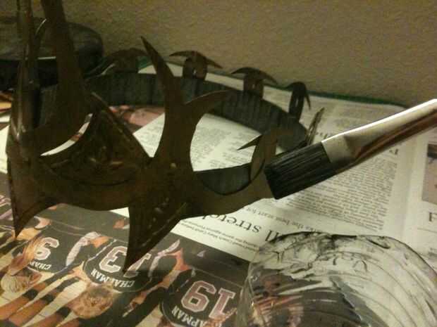 Cuando los colores metálicos se seco yo pegado a la banda de cartón (ahora pintado plata) en el interior de la corona y comenzó en intemperie. Para hacer un efecto de degradado, use una crema mezcla de pintura acrílica negra en el agua. Según el metal que desea replicar, puede que desee utilizar negro y verde, para simular la oxidación. Cepillo de la pintura diluida sobre un área pequeña y dejarlo reposar unos minutos, luego frote hacia arriba con una toalla de papel. Idealmente, debería dejar un poco de pintura en las grietas pequeñas de forma del elemento.