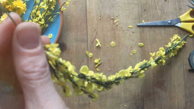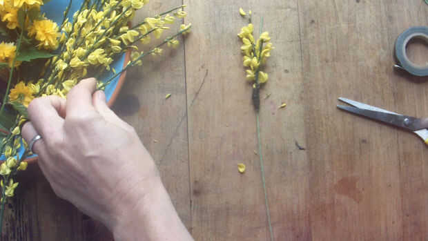 Tomar su segundo mini bouquet y cinta en el alambre para cubrir la cinta del ramo anterior. Continuar hasta cubre el cable entero.