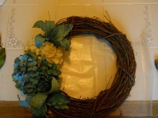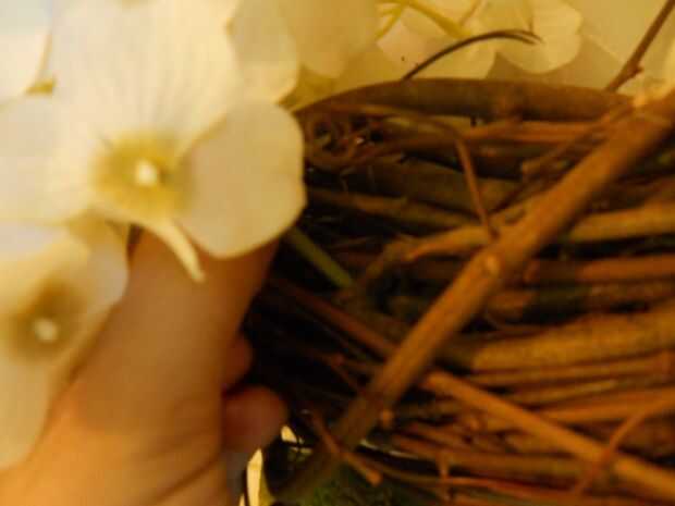 A continuación, coloque las flores (sin pegamento) en la corona. Escoger un lugar y me guía mi madre restantes en las ramas de la guirnalda. Hacerlo sin pegamento le permite revisar el aspecto general de la corona.