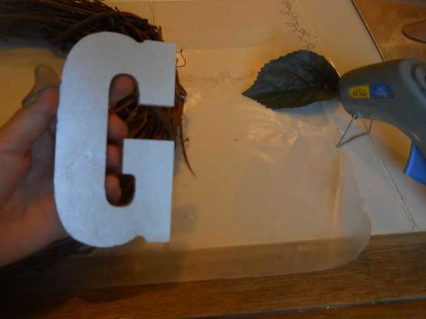 A continuación, agregue el pegamento a la parte posterior de la carta que ha elegido. Coloque la letra en la corona y presione firmemente hacia abajo. Estoy usando un G plata encontré.
