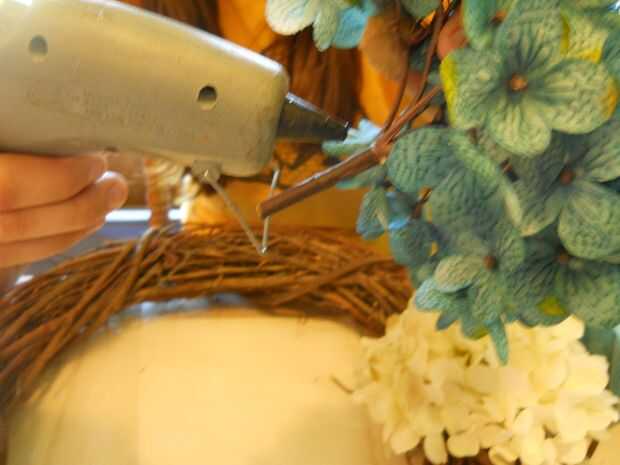 Una vez que estés satisfecho con el diseño puede quitar las flores, recordar su ubicación. A partir de la flor en el centro, aplique una tira de pegamento a lo largo del tallo cortado. Rápidamente Coloque esta flor en su ubicación correcta en la corona. Repita para tus flores restantes.
