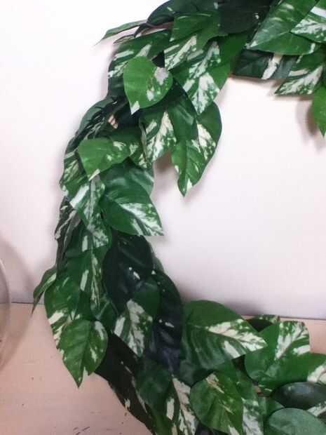 Quite los pares de hojas de los tallos. Debe haber hojas de about12 y 2-4 conjuntos de 3 hojas por racimo de la hoja. Corte las hojas pareadas entre sí. Usando el pegamento caliente, añadir un poco de pegamento a las colas de plástico de las hojas, disponer en corona y deje para enfriar. Trate de mantener la mezcla de hojas alternando orgánicamente entre luz, oscuros, grandes y pequeñas hojas. Cubrir todos los lugares que muestra a través de la madera.