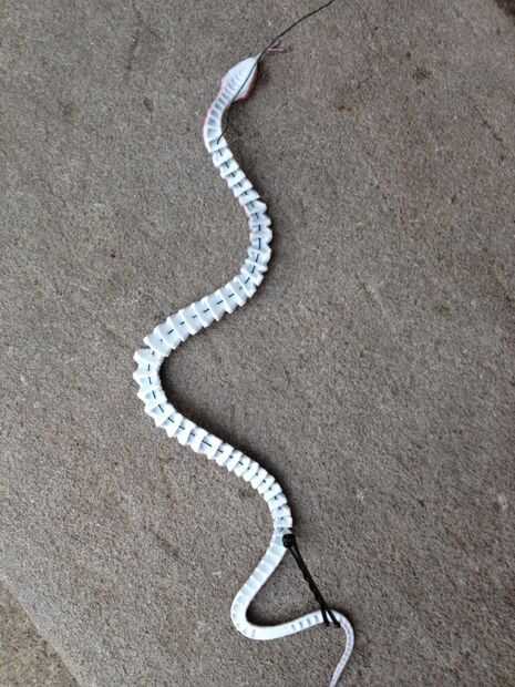 2. Un pedazo largo de alambre fino a través de los segmentos de la serpiente, dejando unas pocas pulgadas de hilo en la cola y la cabeza de la serpiente del hilo de rosca.