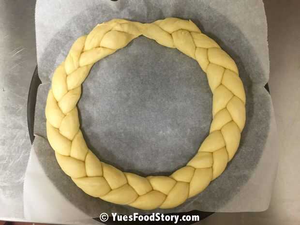 Poner la corona en una bandeja para hornear (yo usé un molde para pizza) con papel sulfurizado sobre la bandeja y entonces puso la bandeja en un lugar cálido para fermentar la segunda vez. Este tiempo debe fermentar unos 30 minutos.