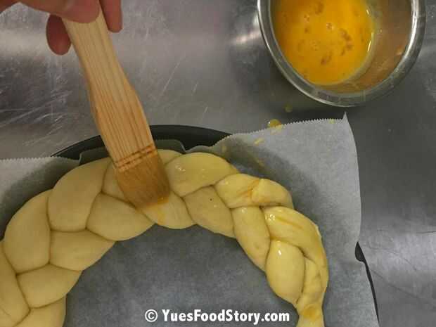 Precalentar el horno a 350° F (180° C) y luego cepillar la corona con la mezcla de huevo restante (ver ingredientes).