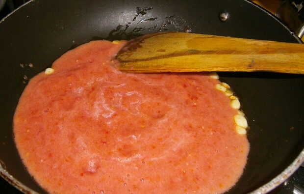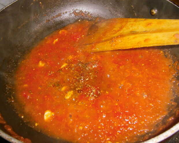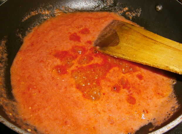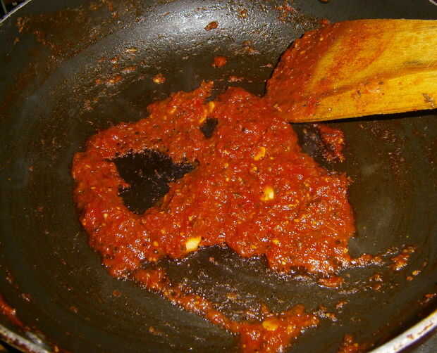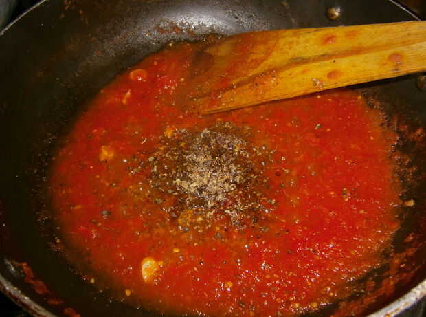 Caliente el aceite, agregar la cebolla, el ajo y saltear hasta dorar ligeramente en color. Añadir el puré de tomate. Deje que se cocine hasta que el olor crudo y ha reducido el puré. Añadir el orégano, pimienta, sal, azúcar, copos de guindilla en esta etapa. Traer juntos.