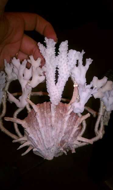 Usar una concha grande para un pedazo de centro y asegurar con pegamento caliente a la base. Probé un par de maneras de asegurar las cáscaras a la base, pero caliente pegamento demostrado para ser la mejor manera. Había separado las cáscaras que tenía por tamaño y tipos para darle un poco más simetría a la corona. Tuve algunas piezas realmente limpios de coral que usé para los puntos de la corona.