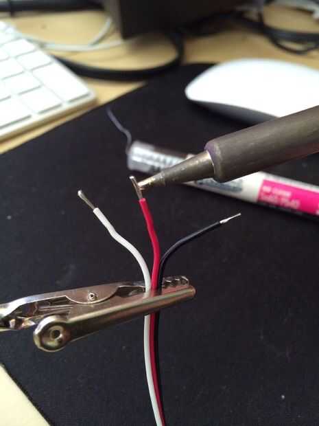 De mis fotos, el cable rojo es el cable de señal, es negro y es blanco Bat +. Envuelve todo en Kapton cinta para mantener las conexiones y para conservar la Junta.