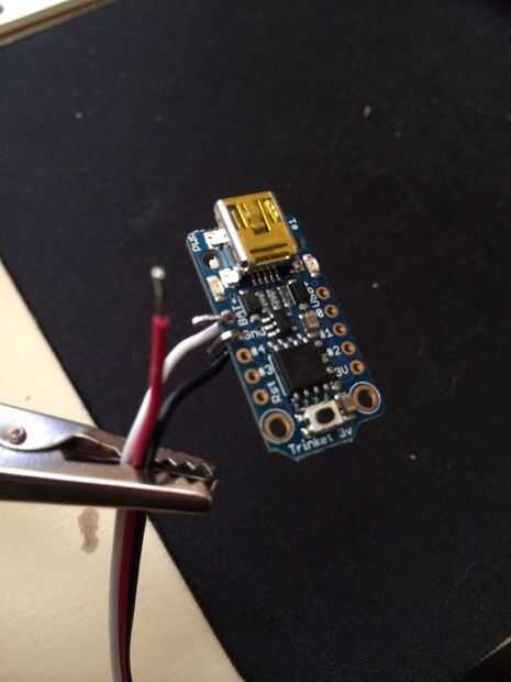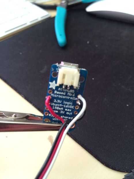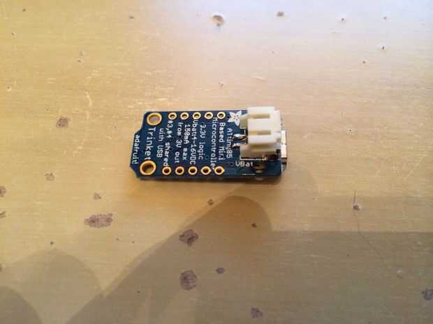 Utilizar el microcontrolador elegido. Elegí de Adafruit 3.3V baratija para su tamaño y costo. Pesa casi nada y es suficiente para manejar el anillo de Neopixel. Me gustaron los 3, 3V versión porque podría utilizar una sola 3.7V batería de LiPo para alimentar la baratija y el anillo sin preocuparse por cambiar la tensión entre los componentes.