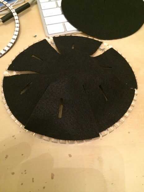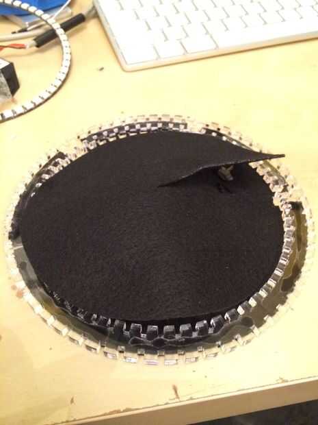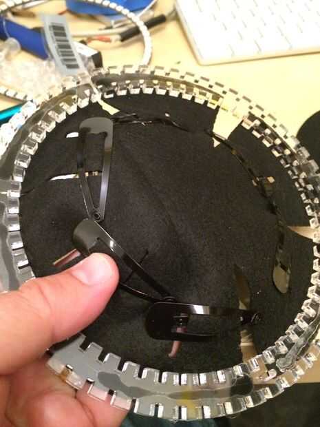 De los primeros dos o tres intentos de corona, no creo que fue importante en relación con el orden de construcción. Da vuelta hacia fuera, recomiendo caliente pegado en el bolsillo primero. El anillo de Neopixel y el conector ya se sueldan en su lugar en el ring pero pegue el fieltro con muescas en la parte inferior del anillo inferior primero. Asegúrese de no tener pegamento en las ranuras de la acrílicas. Podría ser una fuente de rotura de paletas cuando se les instalación. Asegúrese de que una de las ranuras de fieltro está alineada con el orificio de cableado para que los cables bien entrará en el bolsillo y darle acceso a ajustarlas si es necesario.